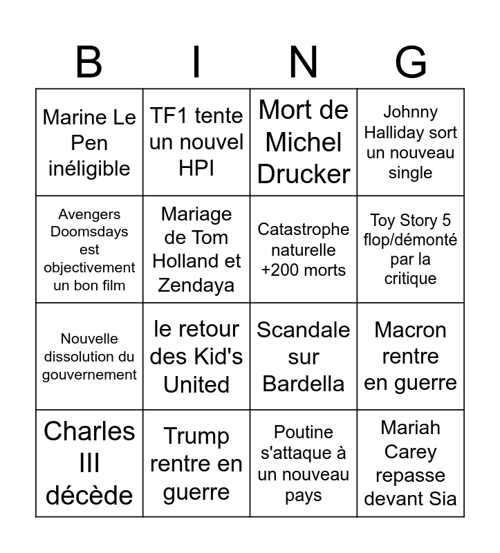 This bingo card has 16 words: Trump rentre en guerre, Macron rentre en guerre, Mort de Michel Drucker, Marine Le Pen inéligible, Nouvelle dissolution du gouvernement, TF1 tente un nouvel HPI, Scandale sur Bardella, Poutine s'attaque à un nouveau pays, Avengers Doomsdays est objectivement un bon film, Mariage de Tom Holland et Zendaya, Charles III décède, Johnny Halliday sort un nouveau single, le retour des Kid's United, Toy Story 5 flop/démonté par la critique, Catastrophe naturelle +200 morts and Mariah Carey repasse devant Sia.