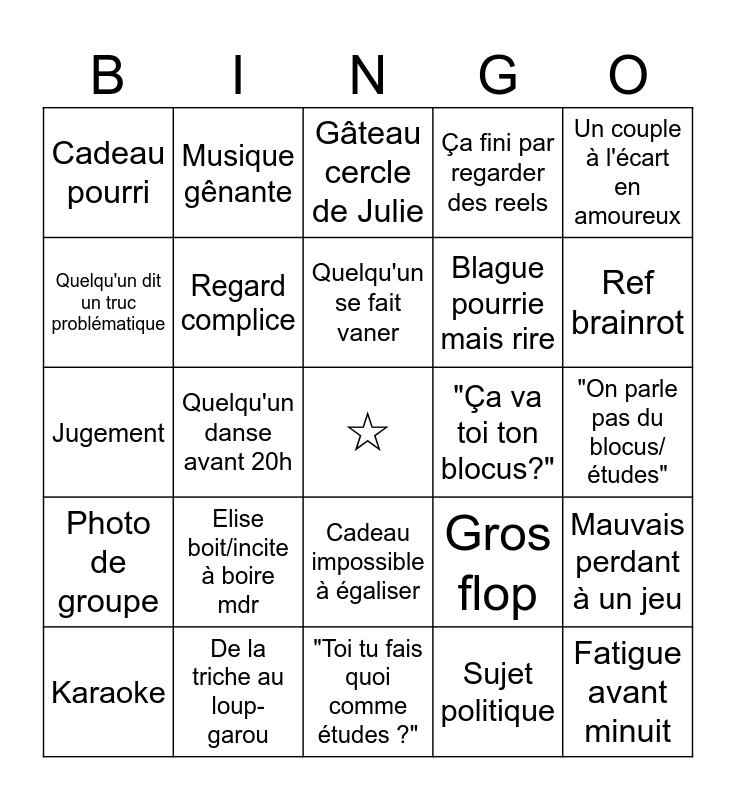 This bingo card has a free space and 24 words: Elise boit/incite à boire mdr, De la triche au loup-garou, Quelqu'un se fait vaner, Karaoke, Un couple à l'écart en amoureux, Cadeau pourri, Quelqu'un dit un truc problématique, Musique gênante, "Ça va toi ton blocus?", Cadeau impossible à égaliser, Blague pourrie mais rire, Jugement, Gros flop, Mauvais perdant à un jeu, Regard complice, Sujet politique, "On parle pas du blocus/études", Gâteau cercle de Julie, Ref brainrot, Quelqu'un danse avant 20h, Fatigue avant minuit, Photo de groupe, Ça fini par regarder des reels and "Toi tu fais quoi comme études ?".