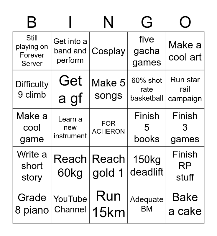 This bingo card has a free space and 24 words: Reach 60kg, YouTube Channel, Make 5 songs, Grade 8 piano, Make a cool art, Still playing on Forever Server, Difficulty 9 climb, Get into a band and perform, Finish 5 books, Reach gold 1, 60% shot rate basketball, Make a cool game, 150kg deadlift, Finish RP stuff, Get a gf, Adequate BM, Finish 3 games, Cosplay, Run star rail campaign, Learn a new instrument, Bake a cake, Write a short story, five gacha games and Run 15km.