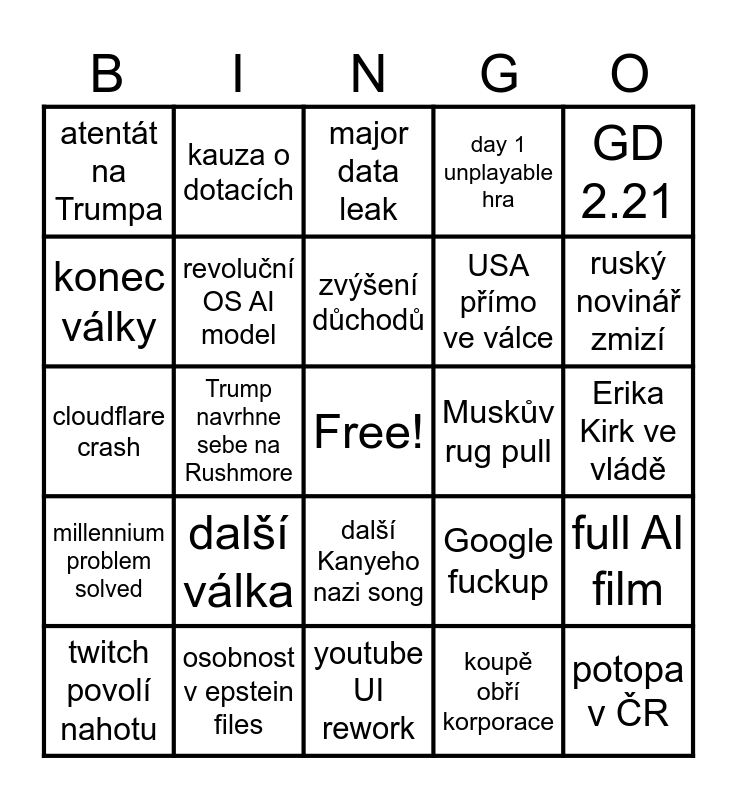 This bingo card has a free space and 24 words: další válka, osobnost v epstein files, zvýšení důchodů, twitch povolí nahotu, GD 2.21, atentát na Trumpa, konec války, kauza o dotacích, Muskův rug pull, další Kanyeho nazi song, USA přímo ve válce, cloudflare crash, Google fuckup, full AI film, revoluční OS AI model, koupě obří korporace, Erika Kirk ve vládě, major data leak, ruský novinář zmizí, Trump navrhne sebe na Rushmore, potopa v ČR, millennium problem solved, day 1 unplayable hra and youtube UI rework.