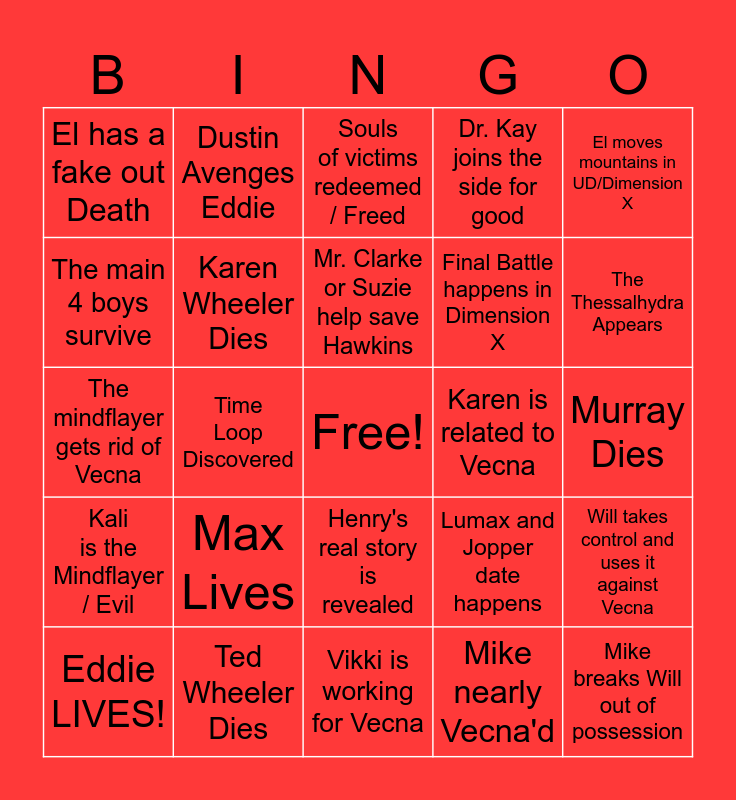 This bingo card has a free space and 24 words: Max Lives, Ted Wheeler Dies, Mr. Clarke or Suzie help save Hawkins, Eddie LIVES!, El moves mountains in UD/Dimension X, El has a fake out Death, The main 4 boys survive, Dustin Avenges Eddie, Karen is related to Vecna, Henry's real story is revealed, Final Battle happens in Dimension X, The mindflayer gets rid of Vecna, Lumax and Jopper date happens, Will takes control and uses it against Vecna, Karen Wheeler Dies, Mike nearly Vecna'd, Murray Dies, Souls of victims redeemed / Freed, The Thessalhydra Appears, Time Loop Discovered, Mike breaks Will out of possession, Kali is the Mindflayer / Evil, Dr. Kay joins the side for good and Vikki is working for Vecna.