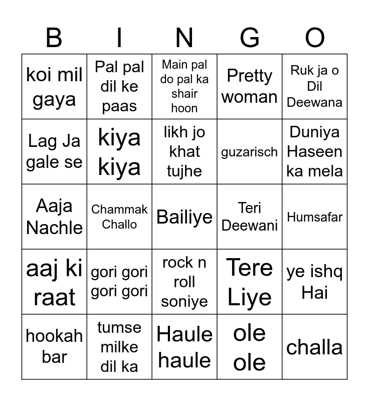 This bingo card has a free space and 39 words: Kesariya, Khuda Jaane, Mitwa, Tere Liye, ye ishq Hai, aaj ki raat, Chammak Challo, Teri meri Kahani, Teri Deewani, Humsafar, Lag Ja gale se, Pal pal dil ke paas, Jeevan ke din, Duniya Haseen ka mela, Aaja Nachle, gori gori gori gori, rock n roll soniye, Pretty woman, Its time to disco, hookah bar, kiya kiya, likh jo khat tujhe, ole ole, Ruk ja o Dil Deewana, o mere sona re sona, tumse milke dil ka, Haule haule, Yamla Pagla Deewana, Jane woh kaise log the, koi mil gaya, I am a disco dancer, chand sifarisch, guzarisch, challa, apna bana le, om shanti om, Main pal do pal ka shair hoon, Yeh mera dil Yaar ka Diwana and Chennai Express.