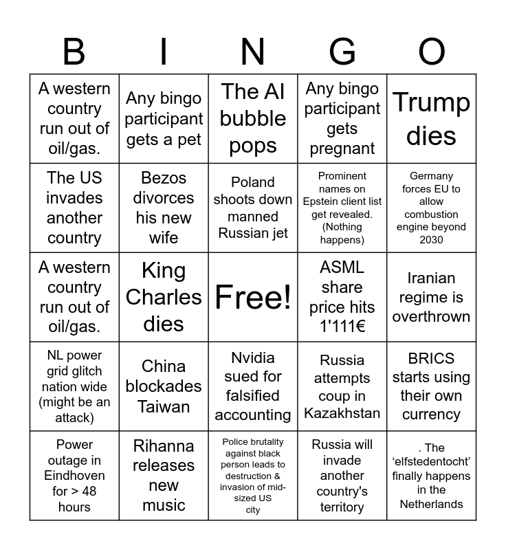 This bingo card has a free space and 24 words: Power outage in Eindhoven for > 48 hours, China blockades Taiwan, Poland shoots down manned Russian jet, Russia will invade another country's territory, Trump dies, A western country run out of oil/gas., Any bingo participant gets a pet, The AI bubble pops, ASML share price hits 1'111€, Iranian regime is overthrown, A western country run out of oil/gas., Bezos divorces his new wife, Russia attempts coup in Kazakhstan, BRICS starts using their own currency, The US invades another country, Rihanna releases new music, Police brutality against black person leads to destruction & invasion of mid-sized US city, Any bingo participant gets pregnant, Germany forces EU to allow combustion engine beyond 2030, NL power grid glitch nation wide (might be an attack), King Charles dies, Nvidia sued for falsified accounting, Prominent names on Epstein client list get revealed. (Nothing happens) and . The ‘elfstedentocht’ finally happens in the Netherlands.