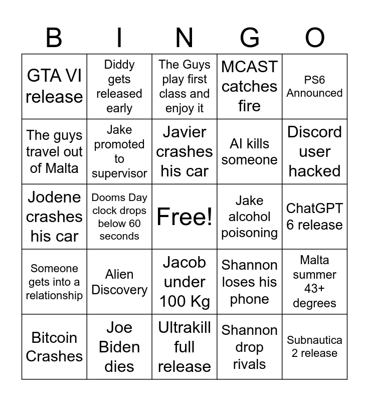 This bingo card has a free space and 24 words: Alien Discovery, Joe Biden dies, Javier crashes his car, Bitcoin Crashes, PS6 Announced, GTA VI release, The guys travel out of Malta, Diddy gets released early, Jake alcohol poisoning, Jacob under 100 Kg, AI kills someone, Jodene crashes his car, Shannon loses his phone, Malta summer 43+ degrees, Jake promoted to supervisor, Shannon drop rivals, ChatGPT 6 release, The Guys play first class and enjoy it, Discord user hacked, Dooms Day clock drops below 60 seconds, Subnautica 2 release, Someone gets into a relationship, MCAST catches fire and Ultrakill full release.