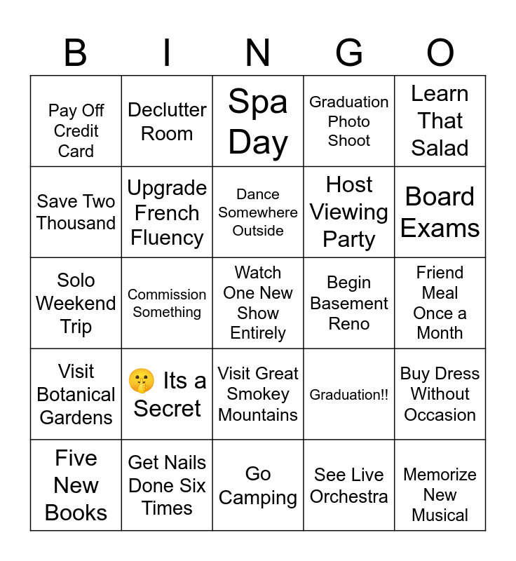 This bingo card has 25 words: 🤫 Its a Secret, Go Camping, Dance Somewhere Outside, Five New Books, Learn That Salad, Pay Off Credit Card, Save Two Thousand, Declutter Room, Begin Basement Reno, Visit Great Smokey Mountains, Host Viewing Party, Solo Weekend Trip, Graduation!!, Buy Dress Without Occasion, Upgrade French Fluency, Memorize New Musical, Friend Meal Once a Month, Spa Day, Board Exams, Commission Something, Watch One New Show Entirely, Get Nails Done Six Times, Visit Botanical Gardens, Graduation Photo Shoot and See Live Orchestra.
