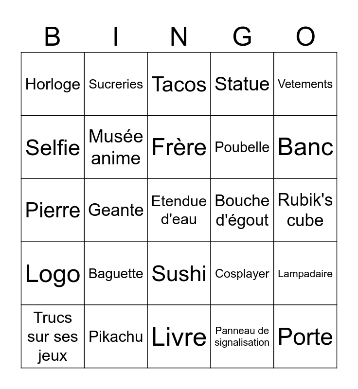 This bingo card has 28 words: Lampadaire, Voiture, Poubelle, Panneau de signalisation, Selfie, Tacos, Sucreries, Logo, Bouche d'égout, Trucs sur ses jeux, Pierre, Statue, Pikachu, Livre, Banc, Animal, Baguette, Musée anime, Frère, Sushi, Horloge, Porte, Etendue d'eau, Geante, Rubik's cube, Cosplayer, Vetements and Monnaie.