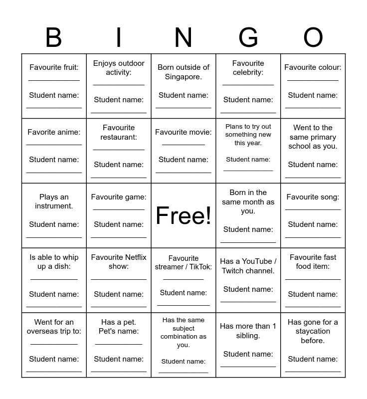 This bingo card has a free space and 24 words: Favourite Netflix show: _____________ Student name: _____________, Has a pet. Pet's name: ___________ Student name: _____________, Favourite movie: __________ Student name: _____________, Went for an overseas trip to: ___________ Student name: _____________, Favourite colour: ____________ Student name: _____________, Favourite fruit: ____________ Student name: _____________, Favorite anime: _____________ Student name: _____________, Enjoys outdoor activity: ____________ Student name: _____________, Born in the same month as you. Student name: _____________, Favourite streamer / TikTok: __________ Student name: _____________, Plans to try out something new this year. Student name: _____________, Plays an instrument. Student name: _____________, Has a YouTube / Twitch channel. Student name: _____________, Favourite fast food item: _____________ Student name: _____________, Favourite restaurant: ____________ Student name: _____________, Has more than 1 sibling. Student name: _____________, Favourite song: _____________ Student name: _____________, Born outside of Singapore. Student name: _____________, Went to the same primary school as you. Student name: _____________, Favourite game: ____________ Student name: _____________, Has gone for a staycation before. Student name: _____________, Is able to whip up a dish: ___________ Student name: _____________, Favourite celebrity: ____________ Student name: _____________ and Has the same subject combination as you. Student name: _____________.