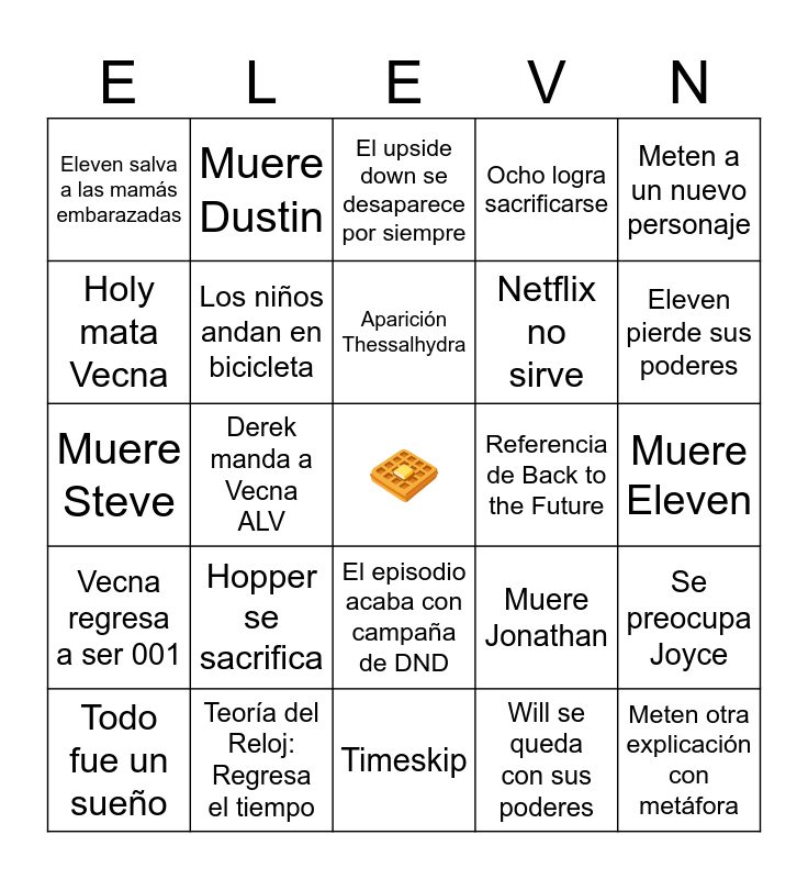 This bingo card has a free space and 24 words: Hopper se sacrifica, Teoría del Reloj: Regresa el tiempo, Aparición Thessalhydra, Todo fue un sueño, Meten a un nuevo personaje, Eleven salva a las mamás embarazadas, Holy mata Vecna, Muere Dustin, Referencia de Back to the Future, El episodio acaba con campaña de DND, Netflix no sirve, Muere Steve, Muere Jonathan, Se preocupa Joyce, Los niños andan en bicicleta, Will se queda con sus poderes, Muere Eleven, El upside down se desaparece por siempre, Eleven pierde sus poderes, Derek manda a Vecna ALV, Meten otra explicación con metáfora, Vecna regresa a ser 001, Ocho logra sacrificarse and Timeskip.
