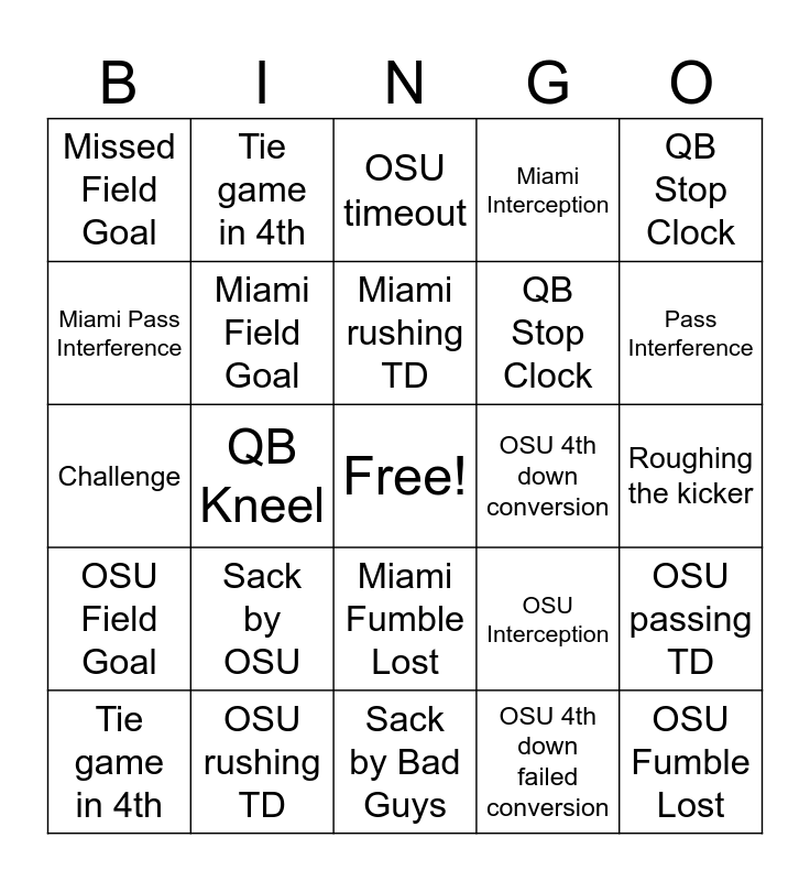 This bingo card has a free space and 35 words: Bad Guys 4th down conversion, Bad Guys Failed 4th down conversion, Tie game in 3rd, Miami Field Goal, Miami Fumble Lost, Miami Interception, Miami Pass Interference, Miami passing TD, Miami rushing TD, Miami timeout, Challenge, QB Stop Clock, Holding, Injury Timeout, Missed Field Goal, OSU 4th down conversion, OSU 4th down failed conversion, QB Kneel, OSU Field Goal, OSU Fumble Lost, OSU Interception, Tie game in 4th, OSU passing TD, OSU rushing TD, OSU timeout, Pass Interference, Personal Foul, QB Kneel, QB Stop Clock, Roughing the kicker, Roughing the passer, Sack by Bad Guys, Sack by OSU, Tie game in 4th and Touchback.