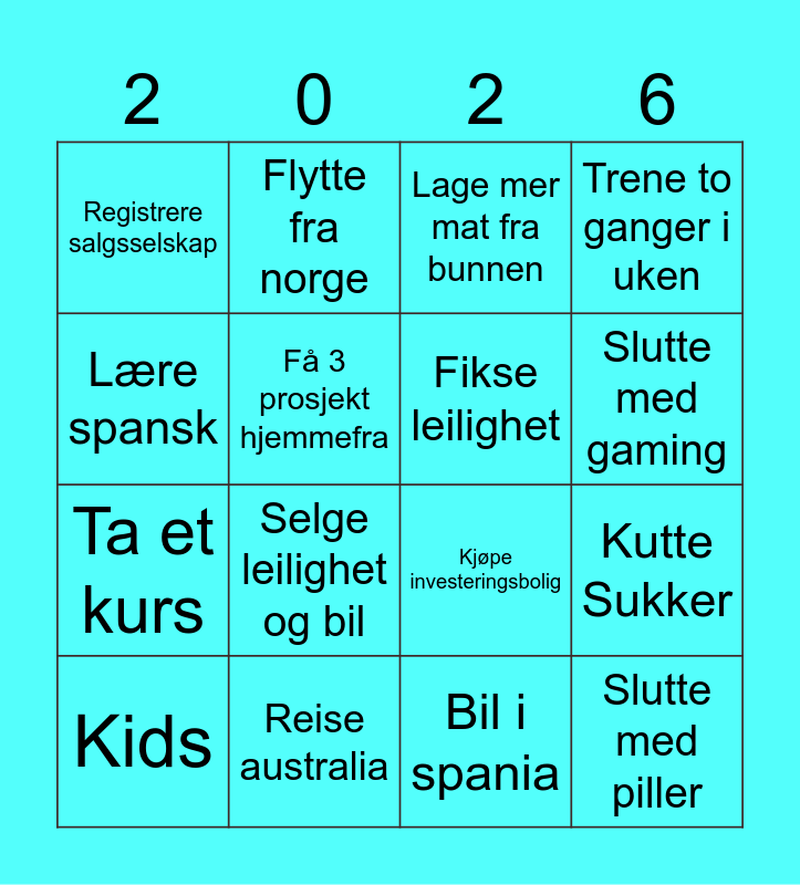 This bingo card has 16 words: Kids, Reise australia, Lage mer mat fra bunnen, Trene to ganger i uken, Lære spansk, Flytte fra norge, Kjøpe investeringsbolig, Kutte Sukker, Registrere salgsselskap, Få 3 prosjekt hjemmefra, Bil i spania, Slutte med gaming, Ta et kurs, Selge leilighet og bil, Fikse leilighet and Slutte med piller.