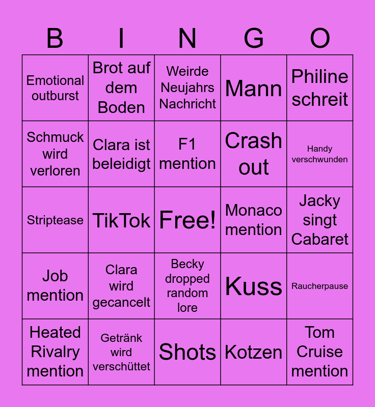 This bingo card has a free space and 24 words: Clara wird gecancelt, Getränk wird verschüttet, F1 mention, Heated Rivalry mention, Philine schreit, Emotional outburst, Schmuck wird verloren, Brot auf dem Boden, Monaco mention, Becky dropped random lore, Crash out, Striptease, Kuss, Raucherpause, Clara ist beleidigt, Kotzen, Jacky singt Cabaret, Weirde Neujahrs Nachricht, Handy verschwunden, TikTok, Tom Cruise mention, Job mention, Mann and Shots.