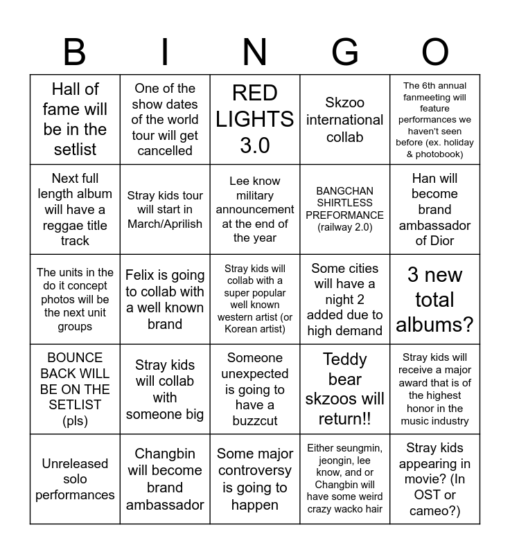 This bingo card has a free space and 24 words: Stray kids will collab with someone big, Changbin will become brand ambassador, Lee know military announcement at the end of the year, Unreleased solo performances, The 6th annual fanmeeting will feature performances we haven’t seen before (ex. holiday & photobook), Hall of fame will be in the setlist, Next full length album will have a reggae title track, One of the show dates of the world tour will get cancelled, Some cities will have a night 2 added due to high demand, Someone unexpected is going to have a buzzcut, BANGCHAN SHIRTLESS PREFORMANCE (railway 2.0), The units in the do it concept photos will be the next unit groups, Teddy bear skzoos will return!!, Stray kids will receive a major award that is of the highest honor in the music industry, Stray kids tour will start in March/Aprilish, Either seungmin, jeongin, lee know, and or Changbin will have some weird crazy wacko hair, 3 new total albums?, RED LIGHTS 3.0, Han will become brand ambassador of Dior, Felix is going to collab with a well known brand, Stray kids appearing in movie? (In OST or cameo?), BOUNCE BACK WILL BE ON THE SETLIST (pls), Skzoo international collab and Some major controversy is going to happen.
