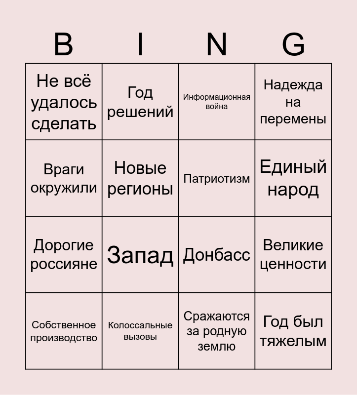 This bingo card has 16 words: Колоссальные вызовы, Великие ценности, Информационная война, Не всё удалось сделать, Дорогие россияне, Год решений, Донбасс, Сражаются за родную землю, Враги окружили, Новые регионы, Собственное производство, Надежда на перемены, Запад, Единый народ, Патриотизм and Год был тяжелым.
