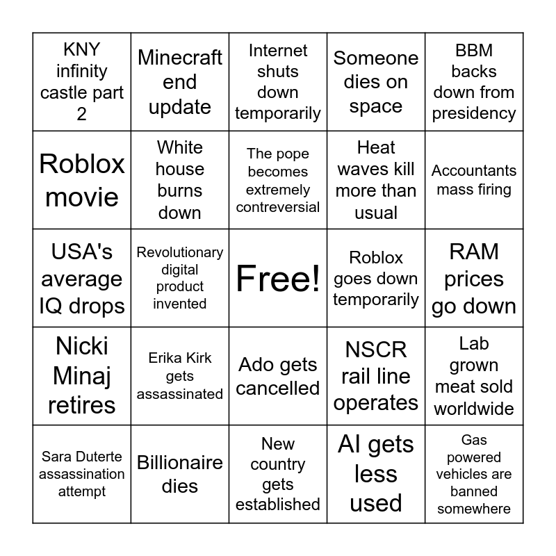 This bingo card has a free space and 24 words: Erika Kirk gets assassinated, Billionaire dies, The pope becomes extremely contreversial, Sara Duterte assassination attempt, BBM backs down from presidency, KNY infinity castle part 2, Roblox movie, Minecraft end update, Roblox goes down temporarily, Ado gets cancelled, Heat waves kill more than usual, USA's average IQ drops, NSCR rail line operates, Lab grown meat sold worldwide, White house burns down, AI gets less used, RAM prices go down, Internet shuts down temporarily, Accountants mass firing, Revolutionary digital product invented, Gas powered vehicles are banned somewhere, Nicki Minaj retires, Someone dies on space and New country gets established.