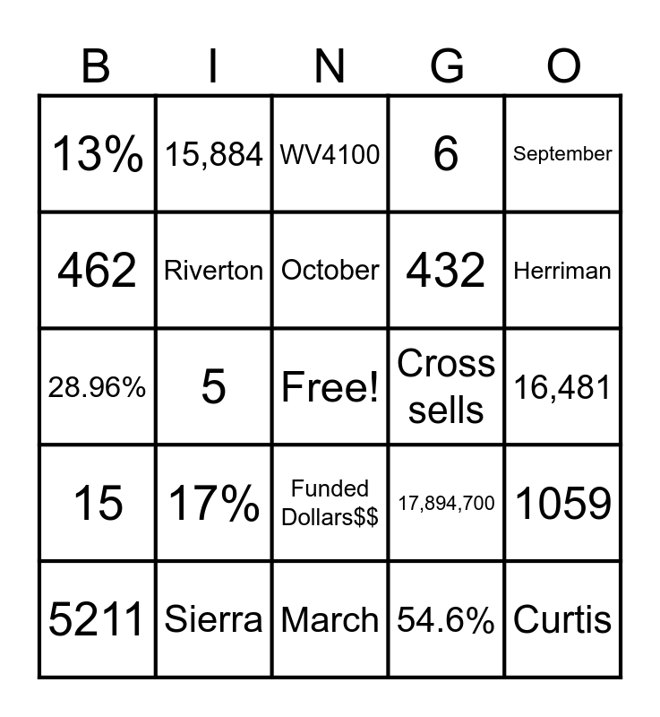 This bingo card has a free space and 25 words: 17%, March, October, 5211, September, 13%, 462, 15,884, Cross sells, Funded Dollars$$, 432, 28.96%, 17,894,700, 1059, Riverton, Queens Creek, 16,481, WV4100, Herriman, 5, Curtis, Sierra, 15, 6 and 54.6%.