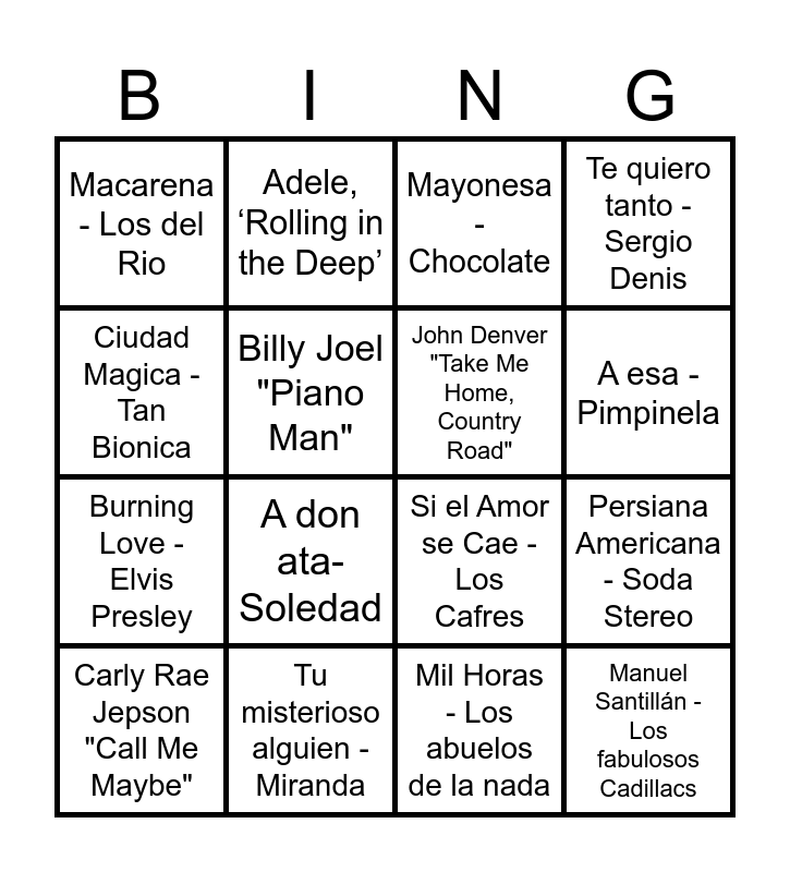 This bingo card has 53 words: Miley Cyrus "Party in the USA", Carly Rae Jepson "Call Me Maybe", Nirvana, ‘Smells Like Teen Spirit’, Billie Eilish 'Bad Guy', Harry Styles 'As It Was', Guns N' Roses "Sweet Child of Mine", Adele, ‘Rolling in the Deep’, The Weeknd "Blinding Lights", Billy Joel "Piano Man", Green Day 'Boulevard of Broken Dreams', John Denver "Take Me Home, Country Road", Imagine Dragons 'Believer', Los Del Rio "Macarena", Surfaces 'Sunday Best', Frozen "Let It Go", Backstreet Boys 'I Want It That Way', A esa - Pimpinela, Tu misterioso alguien - Miranda, No me arrepiento de este amor - Gilda, Ciudad Magica - Tan Bionica, Persiana Americana - Soda Stereo, The Rhythm of the night - Corona, Burning Love - Elvis Presley, Macarena - Los del Rio, La Rubia Tarada - Sumo, Lambada - Kaoma, Ha vuelto el matador- Cacho Castaña, El matador - Los Fabulosos Cadillacs, Stayin Alive - Bee Gees, A don ata- Soledad, One Kiss - Dua Lipa, Eterno Amor - Los Manseros Satiagueños, Motivos - Abel Pintos, Vencedores Vencidos - Los Redondos, Loco (tu forma de ser) - Los Auntenticos Decadentes, 0303456 - Raffaela Carrá, Te quiero tanto - Sergio Denis, Bohemian Rapsody - Queen, Mayonesa - Chocolate, El Bombón - Los palmeras, En septiembre tu fuiste mía - Miguel Alejandro, Ahora te puedes marchar - Luis Miguel, Mil Horas - Los abuelos de la nada, La muralla verde - Los enanitos verdes, Mi perro dinamita - Los redondos, Sigue Girando - Ratones Paranoicos, Rock del Gato - Ratones Paranoicos, Ala Delta - Divididos, Si el Amor se Cae - Los Cafres, Manuel Santillán - Los fabulosos Cadillacs, Descontralado - Jovenes Pordioseros, Never gonna give you up - Rick Astley and What is love - Haddaway.