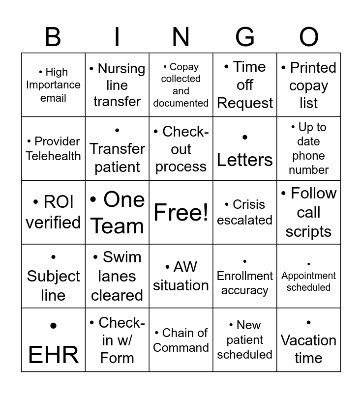 This bingo card has a free space and 24 words: • Swim lanes cleared, • Check-in w/ Form, • Check-out process, • EHR, • Printed copay list, • High Importance email, • Provider Telehealth, • Nursing line transfer, • Crisis escalated, • AW situation, • Letters, • ROI verified, • Enrollment accuracy, • Appointment scheduled, • Transfer patient, • New patient scheduled, • Follow call scripts, • Copay collected and documented, • Up to date phone number, • One Team, • Vacation time, • Subject line, • Time off Request and • Chain of Command.