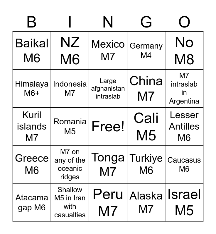 This bingo card has a free space and 24 words: M7 on any of the oceanic ridges, Shallow M5 in Iran with casualties, Large afghanistan intraslab, Atacama gap M6, No M8, Baikal M6, Himalaya M6+, NZ M6, Cali M5, Tonga M7, China M7, Kuril islands M7, Turkiye M6, Caucasus M6, Indonesia M7, Alaska M7, Lesser Antilles M6, Mexico M7, M7 intraslab in Argentina, Romania M5, Israel M5, Greece M6, Germany M4 and Peru M7.