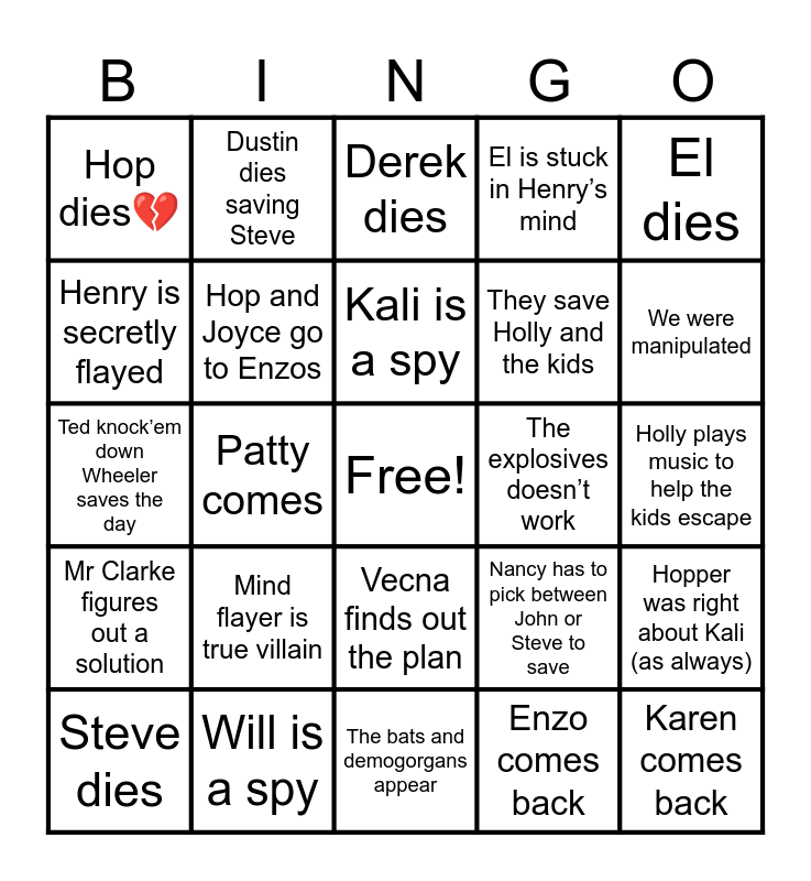 This bingo card has a free space and 24 words: Mind flayer is true villain, Will is a spy, Kali is a spy, Steve dies, El dies, Hop dies💔, Henry is secretly flayed, Dustin dies saving Steve, The explosives doesn’t work, Vecna finds out the plan, They save Holly and the kids, Ted knock’em down Wheeler saves the day, Nancy has to pick between John or Steve to save, Hopper was right about Kali (as always), Hop and Joyce go to Enzos, Enzo comes back, Holly plays music to help the kids escape, Derek dies, We were manipulated, Patty comes, Karen comes back, Mr Clarke figures out a solution, El is stuck in Henry’s mind and The bats and demogorgans appear.