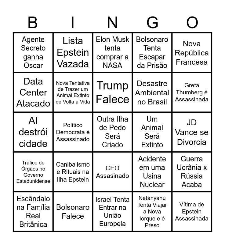 This bingo card has a free space and 24 words: Canibalismo e Rituais na Ilha Epstein, Bolsonaro Falece, Trump Falece, Escândalo na Família Real Britânica, Nova República Francesa, Agente Secreto ganha Oscar, Data Center Atacado, Lista Epstein Vazada, Um Animal Será Extinto, CEO Assasinado, Desastre Ambiental no Brasil, AI destrói cidade, Acidente em uma Usina Nuclear, Guerra Ucrânia x Rússia Acaba, Nova Tentativa de Trazer um Animal Extinto de Volta a Vida, Netanyahu Tenta Viajar a Nova Iorque e é Preso, JD Vance se Divorcia, Elon Musk tenta comprar a NASA, Greta Thumberg é Assassinada, Político Democrata é Assassinado, Vítima de Epstein Assassinada, Tráfico de Órgãos no Governo Estadunidense, Bolsonaro Tenta Escapar da Prisão and Israel Tenta Entrar na União Europeia.