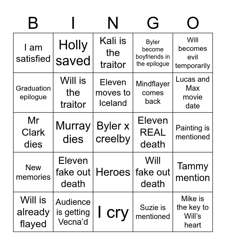 This bingo card has a free space and 24 words: Eleven fake out death, Audience is getting Vecna’d, Eleven moves to Iceland, Will is already flayed, Will becomes evil temporarily, I am satisfied, Graduation epilogue, Holly saved, Eleven REAL death, Heroes, Mindflayer comes back, Mr Clark dies, Will fake out death, Tammy mention, Will is the traitor, Suzie is mentioned, Painting is mentioned, Kali is the traitor, Lucas and Max movie date, Murray dies, Mike is the key to Will’s heart, New memories, Byler become boyfriends in the epilogue and I cry.