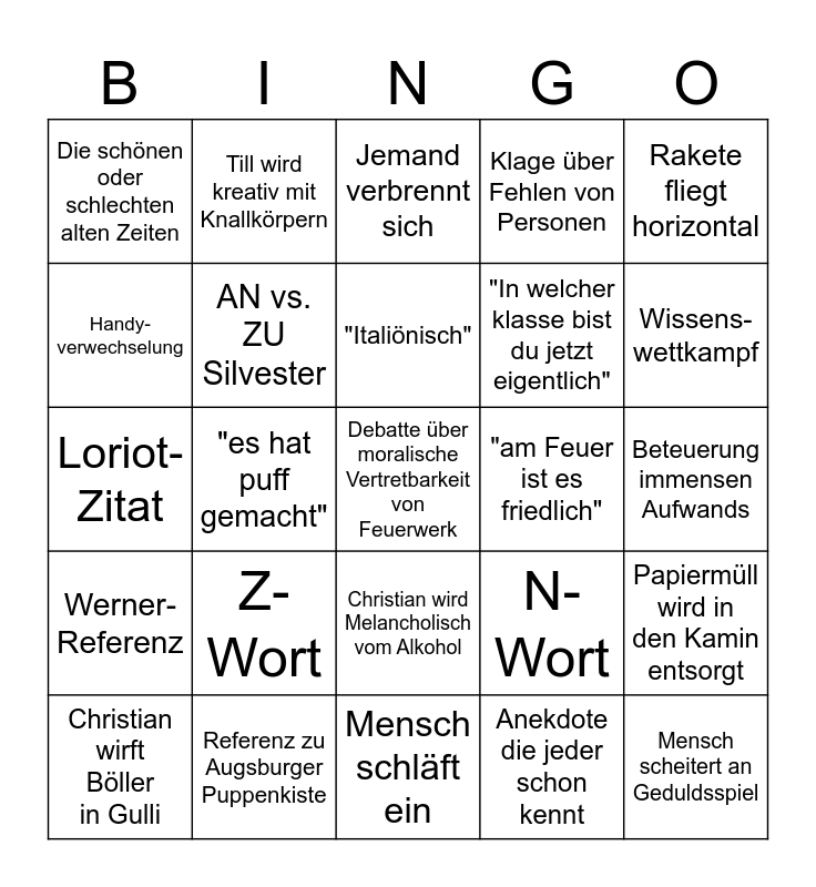 This bingo card has a free space and 34 words: "Törken", Anekdote die jeder schon kennt, Kollektiver Hass aufs Gendern, Dinner for one wird angestellt, Werner-Referenz, AN vs. ZU Silvester, Rakete fliegt horizontal, Christian wirft Böller in Gulli, Till wird kreativ mit Knallkörpern, "Tante Auguri", "Italiönisch", Jemand verbrennt sich, DIE RELLINGER, Damen versammeln sich in der küche, obwohl nicht erwünscht, "am Feuer ist es friedlich", Wissens-wettkampf, Referenz zu Augsburger Puppenkiste, Loriot-Zitat, Z-Wort, N-Wort, Christian wird Melancholisch vom Alkohol, Mensch überwindet Sprachbarriere dank Alk., Die schönen oder schlechten alten Zeiten, Beteuerung immensen Aufwands, Mensch schläft ein, Mensch scheitert an Geduldsspiel, Klage über Fehlen von Personen, Schimpf über das Schulsystem, "In welcher klasse bist du jetzt eigentlich", Handy-verwechselung, "Schatziii", "es hat puff gemacht", Papiermüll wird in den Kamin entsorgt and 3D-Drucker-Liebe..