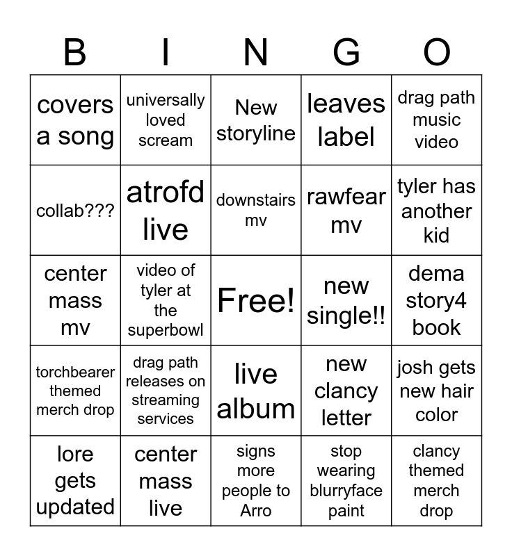 This bingo card has a free space and 24 words: drag path releases on streaming services, center mass live, downstairs mv, lore gets updated, drag path music video, covers a song, collab???, universally loved scream, new single!!, live album, rawfear mv, center mass mv, new clancy letter, josh gets new hair color, atrofd live, stop wearing blurryface paint, dema story4 book, New storyline, tyler has another kid, video of tyler at the superbowl, clancy themed merch drop, torchbearer themed merch drop, leaves label and signs more people to Arro.