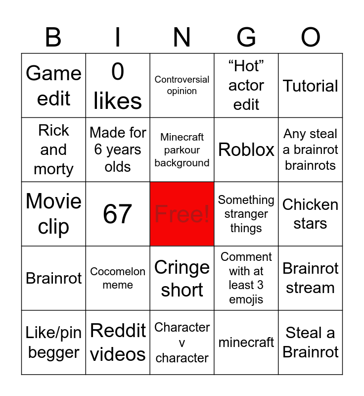 This bingo card has a free space and 24 words: Like/pin begger, Cocomelon meme, Minecraft parkour background, minecraft, Tutorial, Game edit, 0 likes, Controversial opinion, Something stranger things, Chicken stars, Movie clip, Made for 6 years olds, Comment with at least 3 emojis, Brainrot stream, Rick and morty, Reddit videos, Character v character, “Hot” actor edit, Any steal a brainrot brainrots, Brainrot, 67, Cringe short, Roblox and Steal a Brainrot.