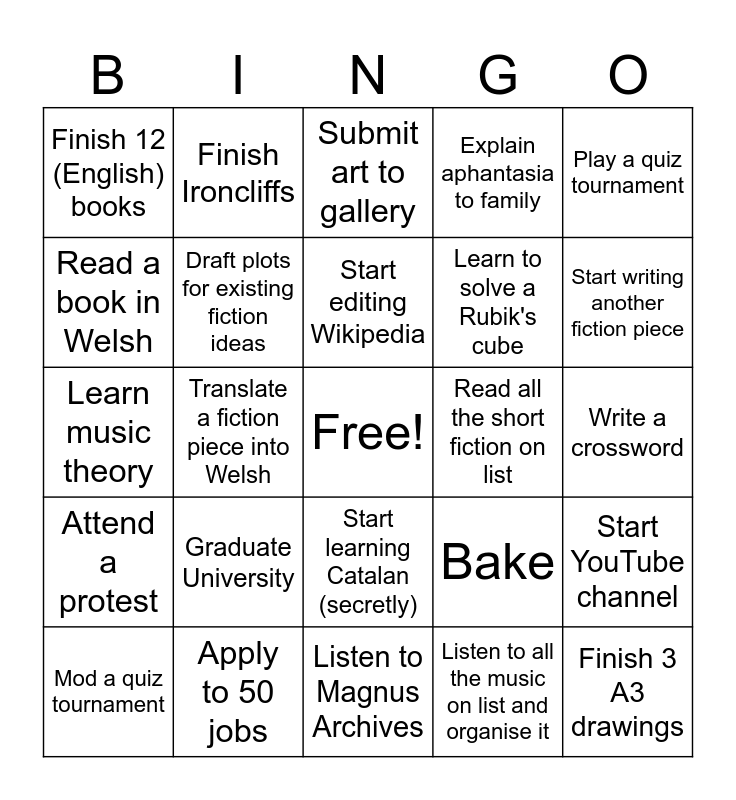 This bingo card has a free space and 24 words: Graduate University, Apply to 50 jobs, Start editing Wikipedia, Mod a quiz tournament, Play a quiz tournament, Finish 12 (English) books, Read a book in Welsh, Finish Ironcliffs, Read all the short fiction on list, Start learning Catalan (secretly), Learn to solve a Rubik's cube, Learn music theory, Bake, Start YouTube channel, Draft plots for existing fiction ideas, Listen to all the music on list and organise it, Write a crossword, Submit art to gallery, Start writing another fiction piece, Translate a fiction piece into Welsh, Finish 3 A3 drawings, Attend a protest, Explain aphantasia to family and Listen to Magnus Archives.