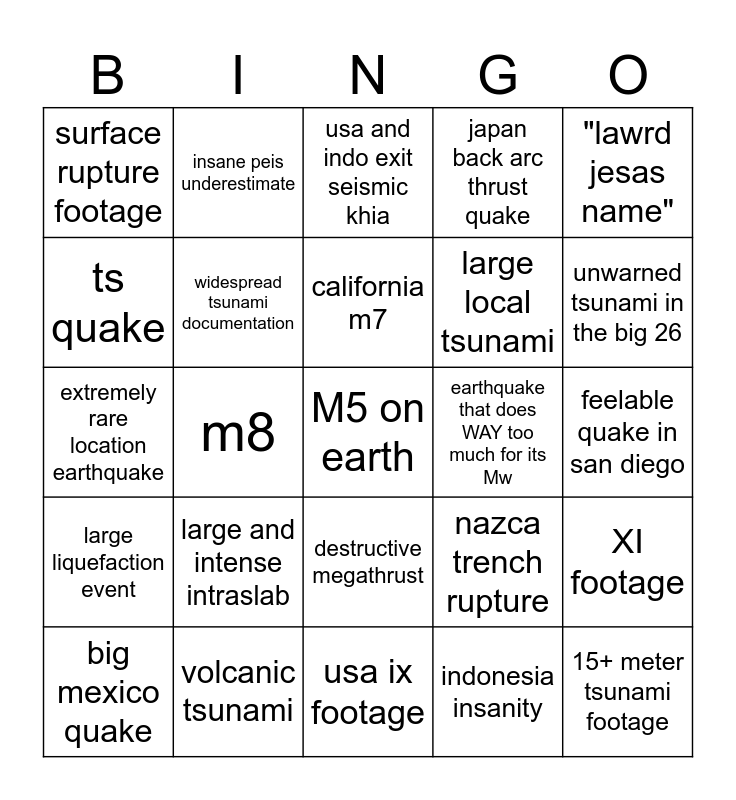 This bingo card has a free space and 24 words: large and intense intraslab, volcanic tsunami, california m7, big mexico quake, "lawrd jesas name", surface rupture footage, ts quake, insane peis underestimate, earthquake that does WAY too much for its Mw, destructive megathrust, large local tsunami, extremely rare location earthquake, nazca trench rupture, XI footage, widespread tsunami documentation, indonesia insanity, feelable quake in san diego, usa and indo exit seismic khia, unwarned tsunami in the big 26, m8, 15+ meter tsunami footage, large liquefaction event, japan back arc thrust quake and usa ix footage.