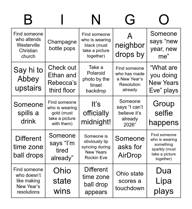 This bingo card has a free space and 28 words: Find someone who is wearing something sparkly (must take a picture together), Find someone with a birthday in December, Find someone who has made a New Year’s Resolution already, Ohio state scores a touchdown, Say hi to Abbey upstairs, Find someone who is wearing black (must take a picture together), Champagne bottle pops, Different time zone ball drops, Someone says “I can’t believe it’s already 2026”, Find someone who doesn’t like making New Year’s resolutions, Someone spills a drink, A neighbor drops by, Ohio state wins, Different time zone ball drop appears, “What are you doing New Years Eve” plays, Someone says “thank goodness 2025 is over”, Someone says “I’m tired already”, Check out Ethan and Rebecca’s third floor, Take a Polaroid photo by the tinsel backdrop, Someone is obviously lip syncing during New Years Rockin Eve, Find someone who attends Westerville Christian church, Someone says “cheers”, Dua Lipa plays, Find someone who is wearing gold (must take a picture with them), Group selfie happens, Someone asks for AirDrop, Someone says “new year, new me” and Find someone who knew Rebecca in high school.