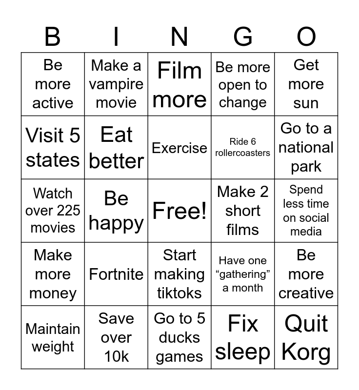 This bingo card has a free space and 24 words: Fortnite, Save over 10k, Exercise, Maintain weight, Get more sun, Be more active, Visit 5 states, Make a vampire movie, Make 2 short films, Start making tiktoks, Ride 6 rollercoasters, Watch over 225 movies, Have one “gathering” a month, Be more creative, Eat better, Fix sleep, Spend less time on social media, Film more, Go to a national park, Be happy, Quit Korg, Make more money, Be more open to change and Go to 5 ducks games.