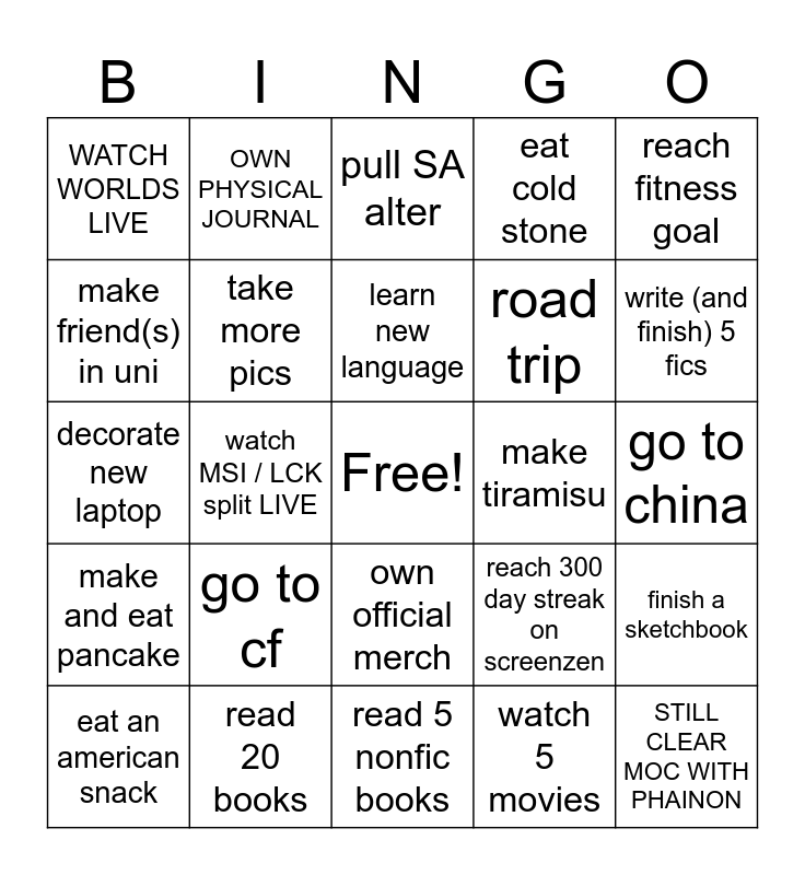 This bingo card has a free space and 24 words: go to cf, read 20 books, learn new language, eat an american snack, reach fitness goal, WATCH WORLDS LIVE, make friend(s) in uni, OWN PHYSICAL JOURNAL, make tiramisu, own official merch, road trip, decorate new laptop, reach 300 day streak on screenzen, finish a sketchbook, take more pics, watch 5 movies, go to china, pull SA alter, write (and finish) 5 fics, watch MSI / LCK split LIVE, STILL CLEAR MOC WITH PHAINON, make and eat pancake, eat cold stone and read 5 nonfic books.