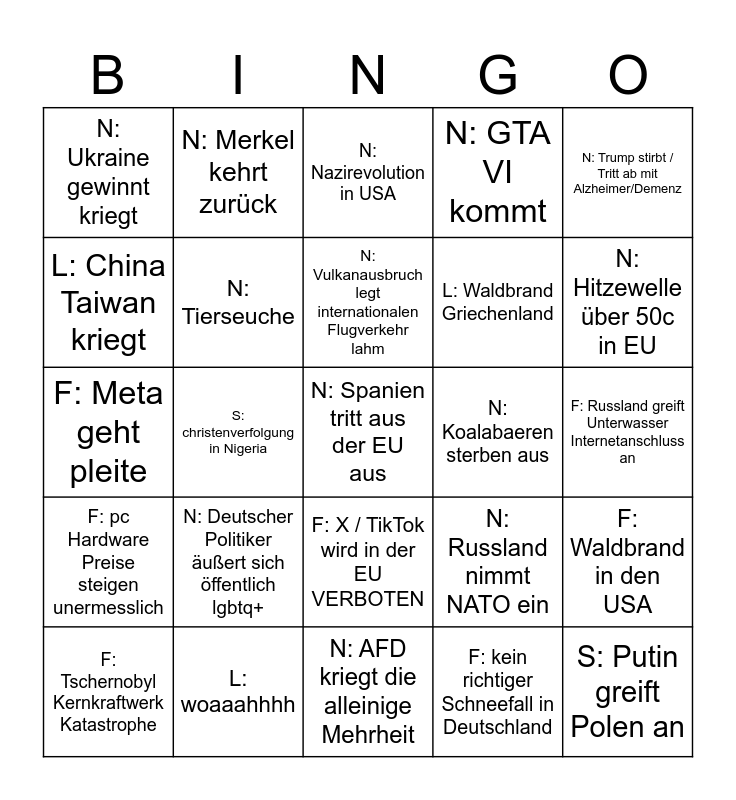This bingo card has a free space and 24 words: N: Deutscher Politiker äußert sich öffentlich lgbtq+, L: woaaahhhh, N: Vulkanausbruch legt internationalen Flugverkehr lahm, F: Tschernobyl Kernkraftwerk Katastrophe, N: Trump stirbt / Tritt ab mit Alzheimer/Demenz, N: Ukraine gewinnt kriegt, L: China Taiwan kriegt, N: Merkel kehrt zurück, N: Koalabaeren sterben aus, F: X / TikTok wird in der EU VERBOTEN, L: Waldbrand Griechenland, F: Meta geht pleite, N: Russland nimmt NATO ein, F: Waldbrand in den USA, N: Tierseuche, F: kein richtiger Schneefall in Deutschland, F: Russland greift Unterwasser Internetanschluss an, N: Nazirevolution in USA, N: Hitzewelle über 50c in EU, S: christenverfolgung in Nigeria, S: Putin greift Polen an, F: pc Hardware Preise steigen unermesslich, N: GTA VI kommt and N: AFD kriegt die alleinige Mehrheit.