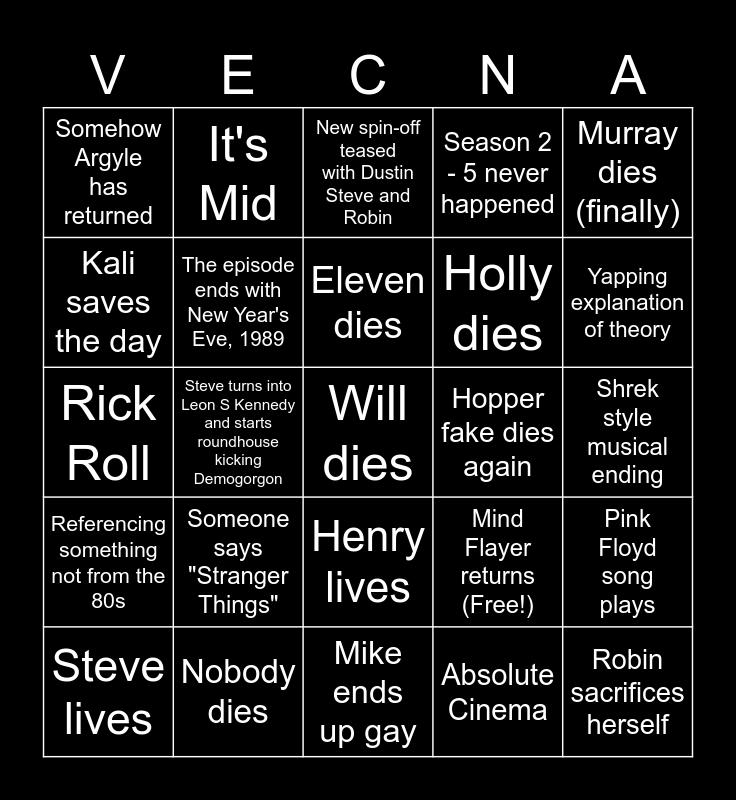 This bingo card has 25 words: Someone says "Stranger Things", Mike ends up gay, Eleven dies, Steve lives, Murray dies (finally), Somehow Argyle has returned, Kali saves the day, It's Mid, Hopper fake dies again, Henry lives, Holly dies, Rick Roll, Mind Flayer returns (Free!), Pink Floyd song plays, The episode ends with New Year's Eve, 1989, Robin sacrifices herself, Shrek style musical ending, New spin-off teased with Dustin Steve and Robin, Yapping explanation of theory, Steve turns into Leon S Kennedy and starts roundhouse kicking Demogorgon, Will dies, Nobody dies, Referencing something not from the 80s, Season 2 - 5 never happened and Absolute Cinema.