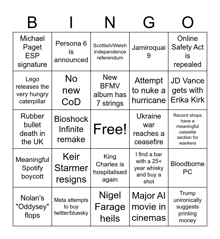 This bingo card has a free space and 24 words: Keir Starmer resigns, Meta attempts to buy twitter/bluesky, New BFMV album has 7 strings, Nolan's "Oddysey" flops, Online Safety Act is repealed, Michael Paget ESP signature, Lego releases the very hungry caterpillar, Persona 6 is announced, Ukraine war reaches a ceasefire, King Charles is hospitalised again, Attempt to nuke a hurricane, Rubber bullet death in the UK, I find a bar with a 25+ year whisky and buy a shot, Bloodborne PC, No new CoD, Major AI movie in cinemas, Record shops have a meaningful cassette section for wankers, Scottish/Welsh independence referendum, JD Vance gets with Erika Kirk, Bioshock Infinite remake, Trump unironically suggests printing money, Meaningful Spotify boycott, Jamiroquai 9 and Nigel Farage heils.