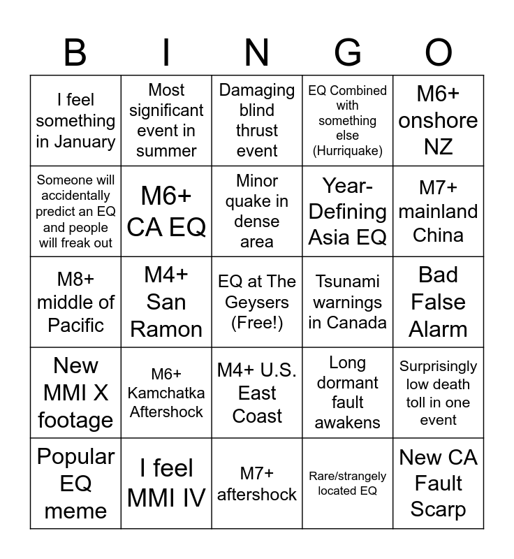 This bingo card has a free space and 24 words: M6+ Kamchatka Aftershock, I feel MMI IV, Minor quake in dense area, Popular EQ meme, M6+ onshore NZ, I feel something in January, Someone will accidentally predict an EQ and people will freak out, Most significant event in summer, Tsunami warnings in Canada, M4+ U.S. East Coast, Year-Defining Asia EQ, M8+ middle of Pacific, Long dormant fault awakens, Surprisingly low death toll in one event, M6+ CA EQ, Rare/strangely located EQ, Bad False Alarm, Damaging blind thrust event, M7+ mainland China, M4+ San Ramon, New CA Fault Scarp, New MMI X footage, EQ Combined with something else (Hurriquake) and M7+ aftershock.