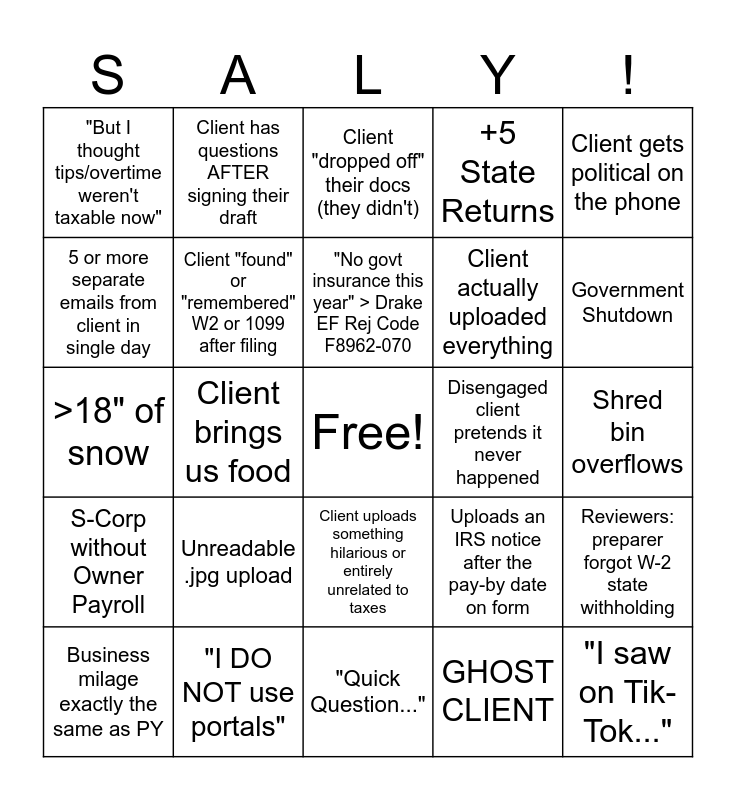 This bingo card has a free space and 24 words: Unreadable .jpg upload, "I DO NOT use portals", "No govt insurance this year" > Drake EF Rej Code F8962-070, Business milage exactly the same as PY, Client gets political on the phone, "But I thought tips/overtime weren't taxable now", 5 or more separate emails from client in single day, Client has questions AFTER signing their draft, Disengaged client pretends it never happened, Client uploads something hilarious or entirely unrelated to taxes, Client actually uploaded everything, >18" of snow, Uploads an IRS notice after the pay-by date on form, Reviewers: preparer forgot W-2 state withholding, Client "found" or "remembered" W2 or 1099 after filing, GHOST CLIENT, Shred bin overflows, Client "dropped off" their docs (they didn't), Government Shutdown, Client brings us food, "I saw on Tik-Tok...", S-Corp without Owner Payroll, +5 State Returns and "Quick Question...".