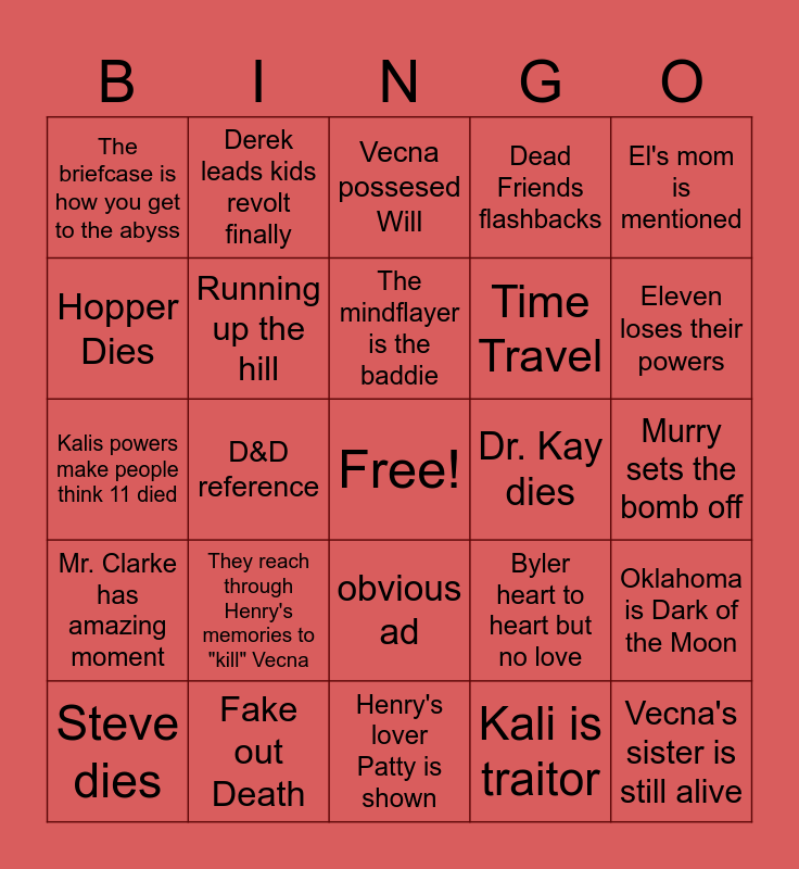 This bingo card has a free space and 24 words: Steve dies, They reach through Henry's memories to "kill" Vecna, The mindflayer is the baddie, Kali is traitor, El's mom is mentioned, The briefcase is how you get to the abyss, Derek leads kids revolt finally, Vecna possesed Will, Dr. Kay dies, Murry sets the bomb off, Kalis powers make people think 11 died, Running up the hill, Byler heart to heart but no love, Oklahoma is Dark of the Moon, Hopper Dies, Fake out Death, Henry's lover Patty is shown, Dead Friends flashbacks, Eleven loses their powers, Mr. Clarke has amazing moment, D&D reference, obvious ad, Time Travel and Vecna's sister is still alive.