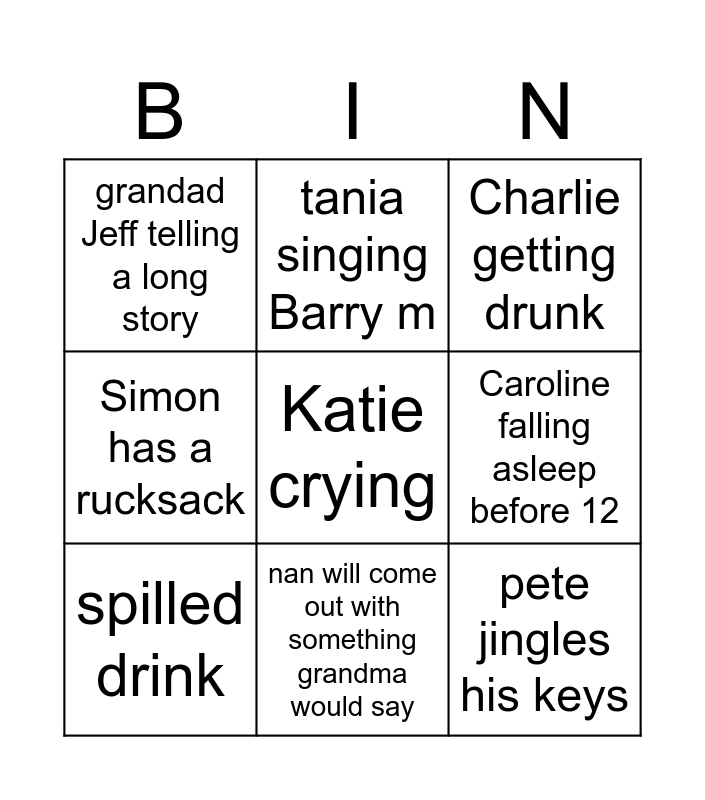 This bingo card has a free space and 8 words: Caroline falling asleep before 12, Charlie getting drunk, tania singing Barry m, spilled drink, grandad Jeff telling a long story, pete jingles his keys, Simon has a rucksack and nan will come out with something grandma would say.