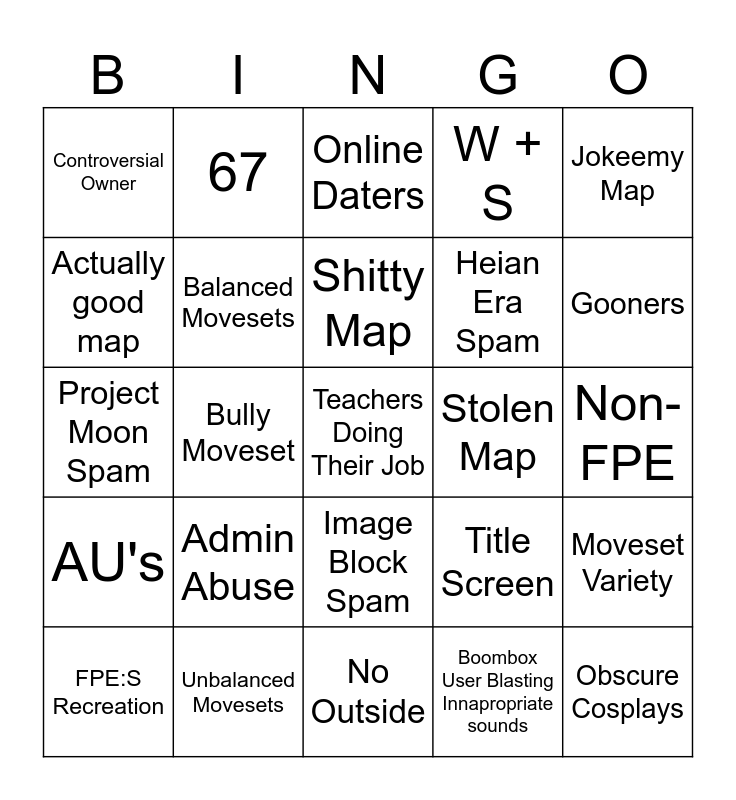 This bingo card has a free space and 24 words: Admin Abuse, Unbalanced Movesets, Shitty Map, FPE:S Recreation, Jokeemy Map, Controversial Owner, Actually good map, 67, Stolen Map, Image Block Spam, Heian Era Spam, Project Moon Spam, Title Screen, Moveset Variety, Balanced Movesets, Boombox User Blasting Innapropriate sounds, Non-FPE, Online Daters, Gooners, Bully Moveset, Obscure Cosplays, AU's, W + S and No Outside.