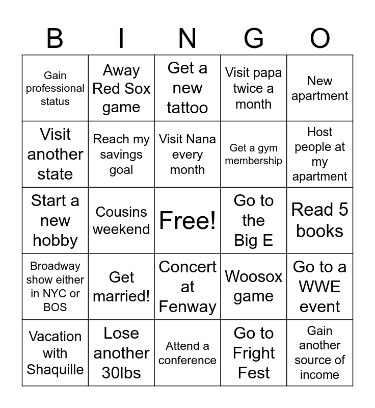 This bingo card has a free space and 24 words: Get married!, Lose another 30lbs, Visit Nana every month, Vacation with Shaquille, New apartment, Gain professional status, Visit another state, Away Red Sox game, Go to the Big E, Concert at Fenway, Get a gym membership, Start a new hobby, Woosox game, Go to a WWE event, Reach my savings goal, Go to Fright Fest, Read 5 books, Get a new tattoo, Host people at my apartment, Cousins weekend, Gain another source of income, Broadway show either in NYC or BOS, Visit papa twice a month and Attend a conference.