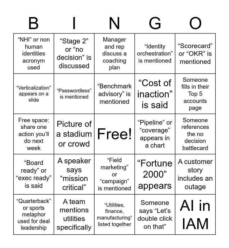 This bingo card has a free space and 50 words: One Team. One Goal. One Season.” is said, AI in IAM, Slide shows a World Cup or sports image, “Utilities, finance, manufacturing” listed together, A speaker says “mission critical”, Customer mentions “audit finding”, “Stage 2” or “no decision” is discussed, A Big Four firm is referenced, “Verticalization” appears on a slide, Someone asks about regulation or compliance, “Passwordless” is mentioned, “Identity orchestration” is mentioned, A customer story includes an outage, “Fortune 2000” appears, Someone says “GTM” or “go to market”, Reference to non human identities / service accounts, “Benchmark advisory” is mentioned, “Pipeline” or “coverage” appears in a chart, Question from the audience about partners, “Scorecard” or “OKR” is mentioned, Picture of a stadium or crowd, Someone says “Let’s double click on that”, “NHI” or non human identities acronym used, “Cost of inaction” is said, Free space: “High five a teammate after a good story”, “30 / 60 / 90 days” appears on a slide, Someone fills in their Top 5 accounts page, “Stage 2 conversion” is mentioned, Manager and rep discuss a coaching plan, “Field marketing” or “campaign” is mentioned, “SiriusDecisions” or “waterfall” is referenced, Someone says “asset gap” or “we’re missing…”, “Message lab” or “before/after” appears, “NRR” or “expansion” is mentioned, A team mentions utilities specifically, A team mentions finance specifically, A team mentions manufacturing specifically, “Customer journey” slide appears, “RACI” or “handoff” is discussed, Someone references the no decision battlecard, A seller asks for a new case study, “Certification” or “training path” is mentioned, “Scorecard” or “dashboard” shows up, Someone says “Let’s put that in the playbook”, “Quarterback” or sports metaphor used for deal leadership, Free space: share one action you’ll do next week, Someone mentions “asset portal” or QR codes, “Service catalog” is shown, “Board ready” or “exec ready” is said and Applause after a team commitment presentation.