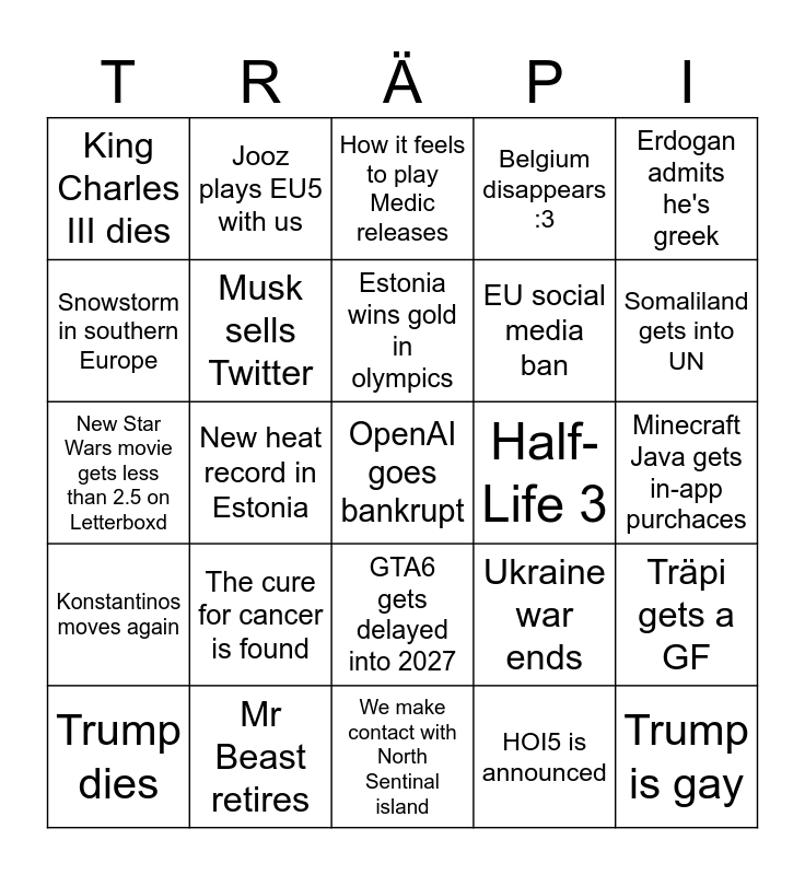 This bingo card has 25 words: The cure for cancer is found, We make contact with North Sentinal island, Estonia wins gold in olympics, Trump dies, Erdogan admits he's greek, King Charles III dies, Snowstorm in southern Europe, Jooz plays EU5 with us, Half-Life 3, GTA6 gets delayed into 2027, EU social media ban, New Star Wars movie gets less than 2.5 on Letterboxd, Ukraine war ends, Träpi gets a GF, Musk sells Twitter, Trump is gay, Minecraft Java gets in-app purchaces, How it feels to play Medic releases, Somaliland gets into UN, New heat record in Estonia, OpenAI goes bankrupt, Mr Beast retires, Konstantinos moves again, Belgium disappears :3 and HOI5 is announced.