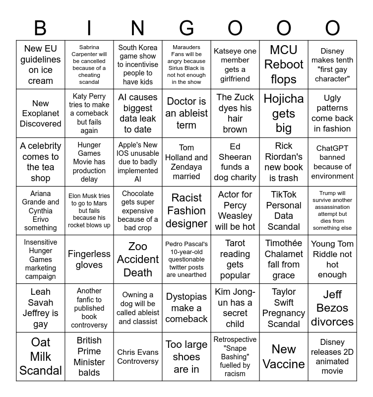 This bingo card has 49 words: Taylor Swift Pregnancy Scandal, Hojicha gets big, Retrospective "Snape Bashing" fuelled by racism, Elon Musk tries to go to Mars but fails because his rocket blows up, Apple's New IOS unusable due to badly implemented AI, Trump will survive another assassination attempt but dies from something else, Sabrina Carpenter will be cancelled because of a cheating scandal, Chris Evans Controversy, MCU Reboot flops, Pedro Pascal's 10-year-old questionable twitter posts are unearthed, Disney makes tenth "first gay character", Marauders Fans will be angry because Sirius Black is not hot enough in the show, Rick Riordan's new book is trash, Ed Sheeran funds a dog charity, Another fanfic to published book controversy, TikTok Personal Data Scandal, New Exoplanet Discovered, Ugly patterns come back in fashion, Jeff Bezos divorces, Katseye one member gets a girlfriend, The Zuck dyes his hair brown, Chocolate gets super expensive because of a bad crop, New EU guidelines on ice cream, Katy Perry tries to make a comeback but fails again, Oat Milk Scandal, AI causes biggest data leak to date, ChatGPT banned because of environment, British Prime Minister balds, Tom Holland and Zendaya married, Hunger Games Movie has production delay, Disney releases 2D animated movie, Actor for Percy Weasley will be hot, Leah Savah Jeffrey is gay, Owning a dog will be called ableist and classist, Ariana Grande and Cynthia Erivo something, Tarot reading gets popular, Timothée Chalamet fall from grace, Young Tom Riddle not hot enough, A celebrity comes to the tea shop, Zoo Accident Death, Dystopias make a comeback, Insensitive Hunger Games marketing campaign, Racist Fashion designer, Too large shoes are in, Doctor is an ableist term, South Korea game show to incentivise people to have kids, Kim Jong-un has a secret child, Fingerless gloves and New Vaccine.