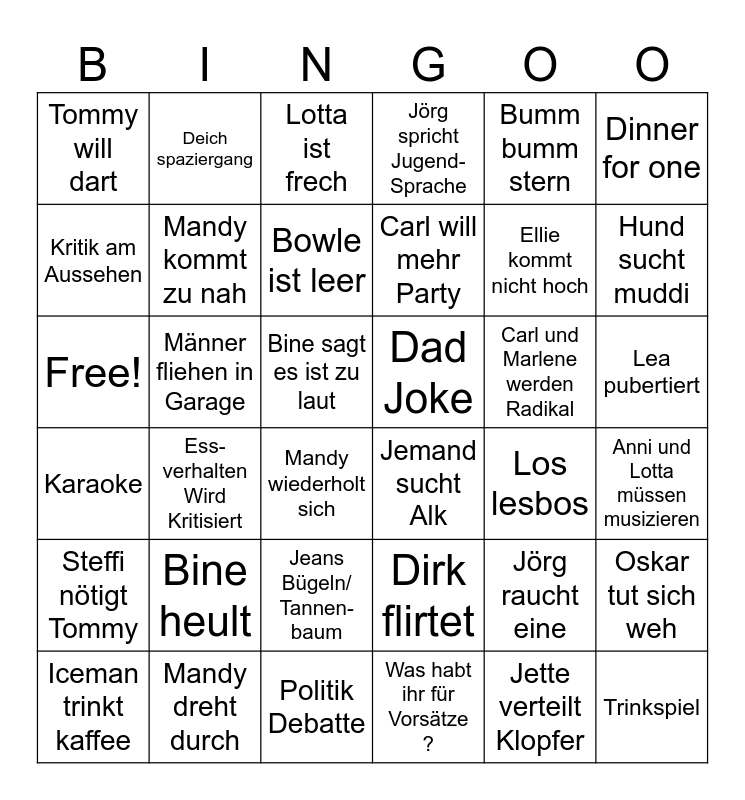 This bingo card has 36 words: Dirk flirtet, Jeans Bügeln/ Tannen-baum, Was habt ihr für Vorsätze ?, Kritik am Aussehen, Karaoke, Dad Joke, Mandy kommt zu nah, Politik Debatte, Bumm bumm stern, Jörg raucht eine, Hund sucht muddi, Jörg spricht Jugend-Sprache, Oskar tut sich weh, Männer fliehen in Garage, Carl will mehr Party, Tommy will dart, Steffi nötigt Tommy, Carl und Marlene werden Radikal, Free!, Lotta ist frech, Bine sagt es ist zu laut, Ess-verhalten Wird Kritisiert, Jemand sucht Alk, Mandy wiederholt sich, Los lesbos, Deich spaziergang, Ellie kommt nicht hoch, Mandy dreht durch, Bowle ist leer, Dinner for one, Trinkspiel, Iceman trinkt kaffee, Anni und Lotta müssen musizieren, Lea pubertiert, Bine heult and Jette verteilt Klopfer.