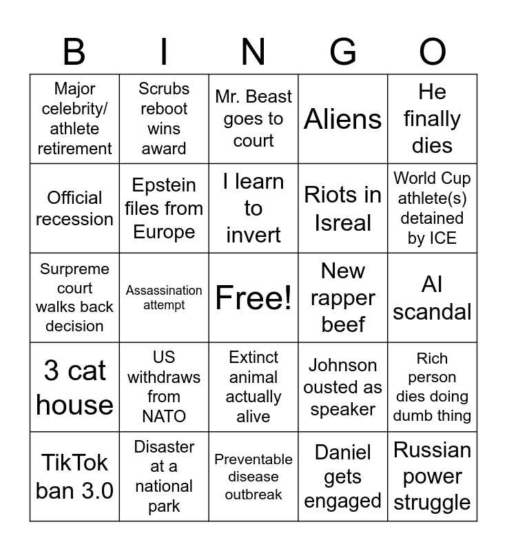 This bingo card has a free space and 24 words: US withdraws from NATO, Disaster at a national park, I learn to invert, TikTok ban 3.0, He finally dies, Major celebrity/ athlete retirement, Official recession, Scrubs reboot wins award, New rapper beef, Extinct animal actually alive, Riots in Isreal, Surpreme court walks back decision, Johnson ousted as speaker, Rich person dies doing dumb thing, Epstein files from Europe, Daniel gets engaged, AI scandal, Mr. Beast goes to court, World Cup athlete(s) detained by ICE, Assassination attempt, Russian power struggle, 3 cat house, Aliens and Preventable disease outbreak.