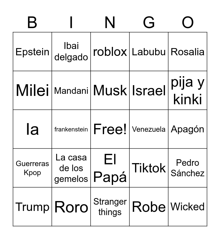 This bingo card has a free space and 24 words: La casa de los gemelos, Roro, Musk, Trump, Rosalia, Epstein, Milei, Ibai delgado, Venezuela, El Papá, Israel, Ia, Tiktok, Pedro Sánchez, Mandani, Robe, Apagón, roblox, pija y kinki, frankenstein, Wicked, Guerreras Kpop, Labubu and Stranger things.
