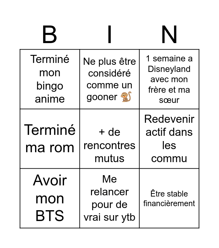 This bingo card has 9 words: Avoir mon BTS, 1 semaine a Disneyland avec mon frère et ma sœur, Ne plus être considéré comme un gooner 🐒, Terminé ma rom, Terminé mon bingo anime, Redevenir actif dans les commu, + de rencontres mutus, Être stable financièrement and Me relancer pour de vrai sur ytb.