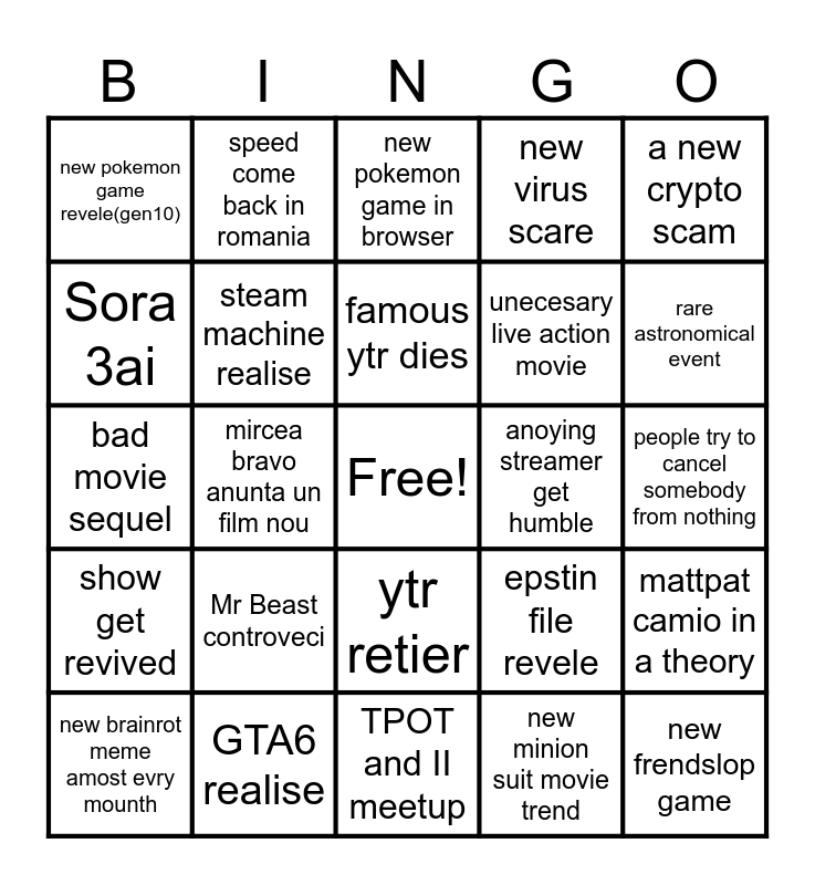 This bingo card has a free space and 24 words: Mr Beast controveci, GTA6 realise, famous ytr dies, new brainrot meme amost evry mounth, a new crypto scam, new pokemon game revele(gen10), Sora 3ai, speed come back in romania, anoying streamer get humble, ytr retier, unecesary live action movie, bad movie sequel, epstin file revele, mattpat camio in a theory, steam machine realise, new minion suit movie trend, people try to cancel somebody from nothing, new pokemon game in browser, rare astronomical event, mircea bravo anunta un film nou, new frendslop game, show get revived, new virus scare and TPOT and II meetup.